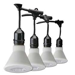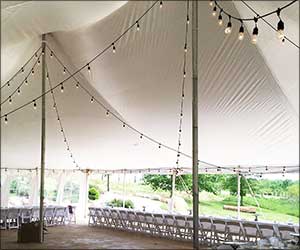 String lights with standard output light bulbs (750 lumen, 60WIE, 7W LED) and high output bulbs (1500 lumen, 100WIE, 12W LED) are used when bright work areas are needed (such as for sales, work areas, training, etc.) Bulbs are spaced 2-ft apart so a large 30x40 tent would have 20 bulbs. Multiple lines are run depending upon the width and brightness wanted. 100WIE bulbs are twice as bright at 60WIE, so do more with less. Cost is only slightly higher than the more decorative bulbs discussed above. |