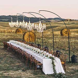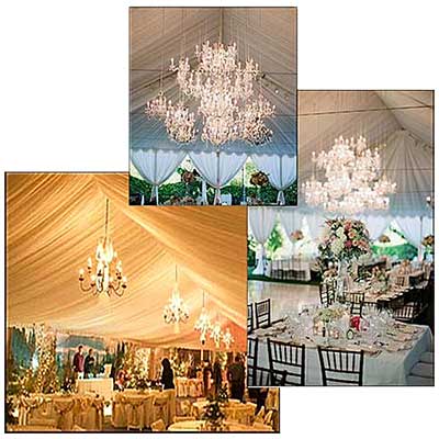 CHANDELIERS add formal grace and beauty to an event. Our large crystal bead chandeliers are re-commended for tents 30' wide or greater due to their peak height. These are our largest chandeliers, 3-ft wide and 6-ft tall and include a dimmable 300WIE LED bulb. When spaced every 20-ft they can provide enough light by themselves for an evening formal event. Larger metal chandeliers provide more light and being larger are better suited for wider tents. Crystal chandeliers can be spaced along the ridge of tents up to 30' wide or 4-10 combined together into a massive cluster chandelier in larger tents creating an awe inspiring result your guests will love! Chandelier hangers make it possible to install chandeliers anywhere, for any event - even completely out in nature! A hidden whisper generator quietly provides all the power needed for the event. |