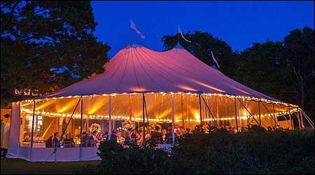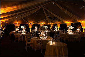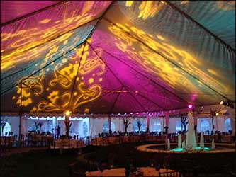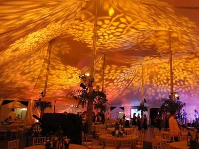 Gobo projectors are stage design lighting systems that contain designs that can be projected in black and white or color onto walls, floors or sides of tents or buildings. Custom Gobos can be made for your unique monogram or message and standard designs (stars, floral and nature designs or symbols) can be projected for a uniquely warm, beautiful design. Gobos allow the tent top to dissolve away as it becomes a field of beauty. 4+ projector packages are available at a 50% OFFSET discount with a full tent package when you book early so any event can have an incredible projected ceiling. For more about tent top gobos, see: CLICK HERE |