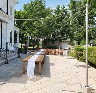 Bistro bulbs are the best suited strands for outdoor runs. Crank up 15 to 20-ft towers are available to raise outdoor installations.