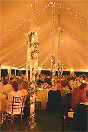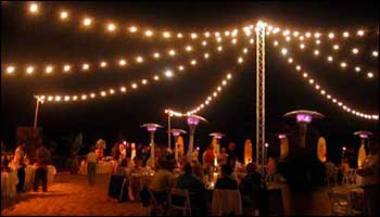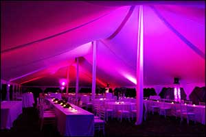 PAR 30 dimmable LED flood light strings provide a unique nightclub feel by directly light down- wards, making the tent top "disappear" after dark. These 75WIE bulbs are spaced 4-ft apart and each provides a warm circular glow of lite on the floor and table below them that fades to dark as the distance increases. Temporary light stands hold light strings so you can add lights just about anywhere! |